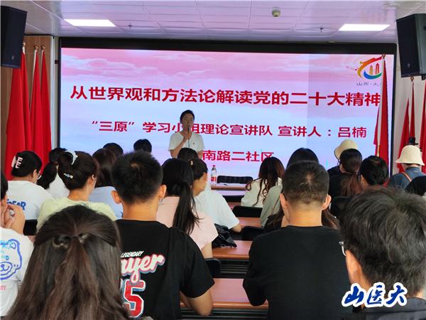 首先迎泽区“三原”学习小组理论宣讲队宣讲员吕楠给大家分享“从世界观和方法论解读党的二十大精神”,演讲从“五个牢牢把握”到做到的六个方面“坚持人民至上、站得要高;坚持自信自立、中国人要立得直;坚持守正创新、在未来要行稳致远;坚持问题导向、谋得要实;坚持系统观念、想的要全面坚持胸怀天下、看得要远”系统生动地解读了党的二十大精神。