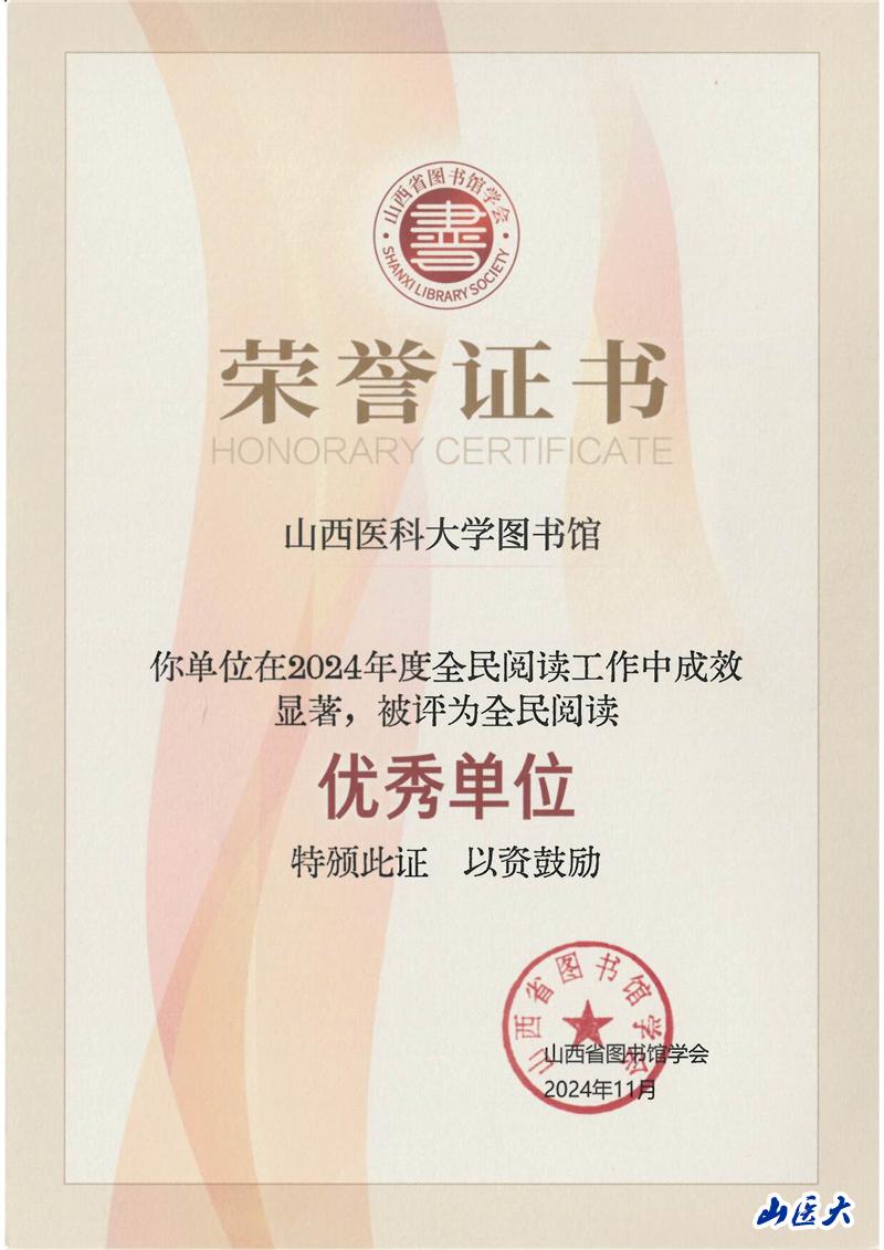 近日,山西省图书馆学会及山西省高等学校图书情报工作委员会开展了评优评先表彰活动,对全省图书馆优秀与先进典型进行表彰。我校图书馆荣获“2024年度全民阅读优秀单位”“山西高校图书馆2022-2023年先进集体”“第二届‘智信杯’山西高校信息素养大赛突出贡献奖”等。