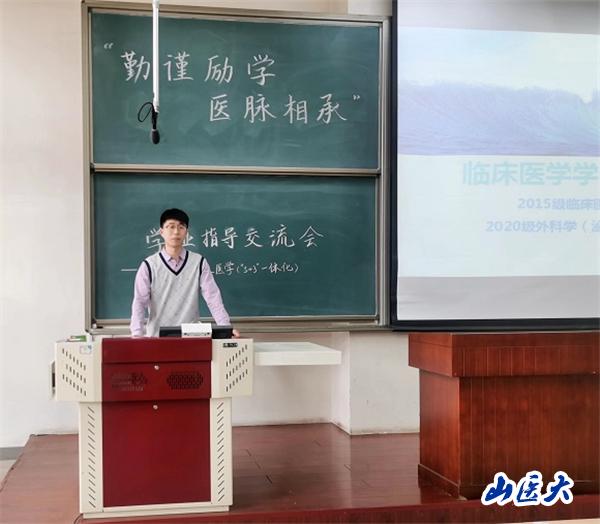 为进一步加强学风建设,引导学生明确学习目标,提升学生学习的主动性,指导学生职业生涯发展规划,4月19日下午,基础医学院在笃行B301教室举办“勤谨励学,医脉相承”学业指导交流会。本次交流会由2015级临床医学(“5+3”一体化)专业张熙同学主讲,思想政治辅导员孟玲先老师主持,2020级临床医学(“5+3”一体化)专业全体同学参加。
