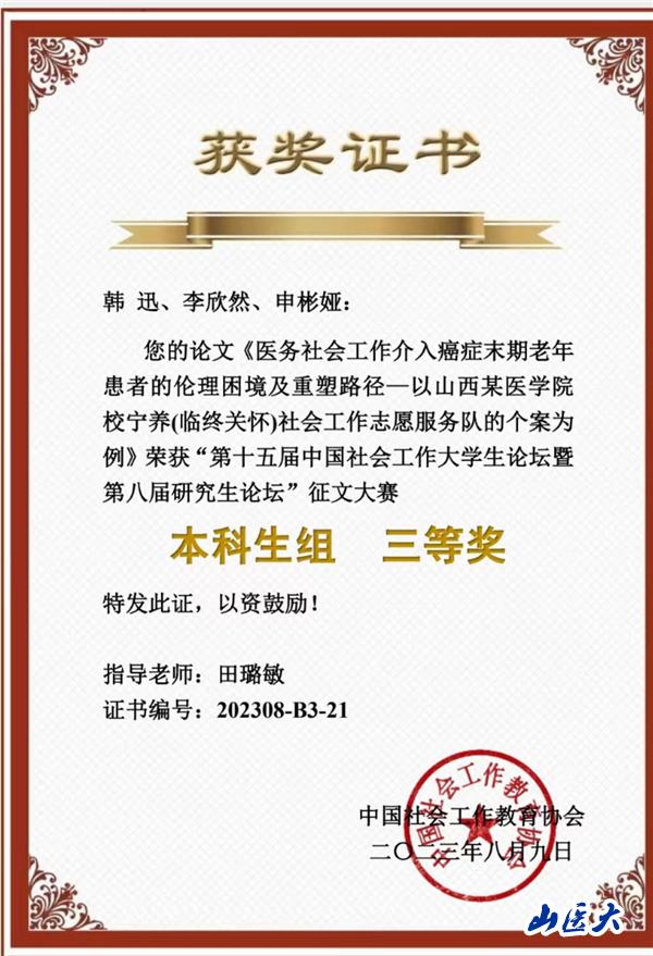 本届论坛共有98所高校的157篇获奖作品分获一二三等奖。其中,我校人文社会科学学院2020级社会工作专业本科生韩迅、李欣然、申彬娅三位同学的合作论文荣获本科生组三等奖。