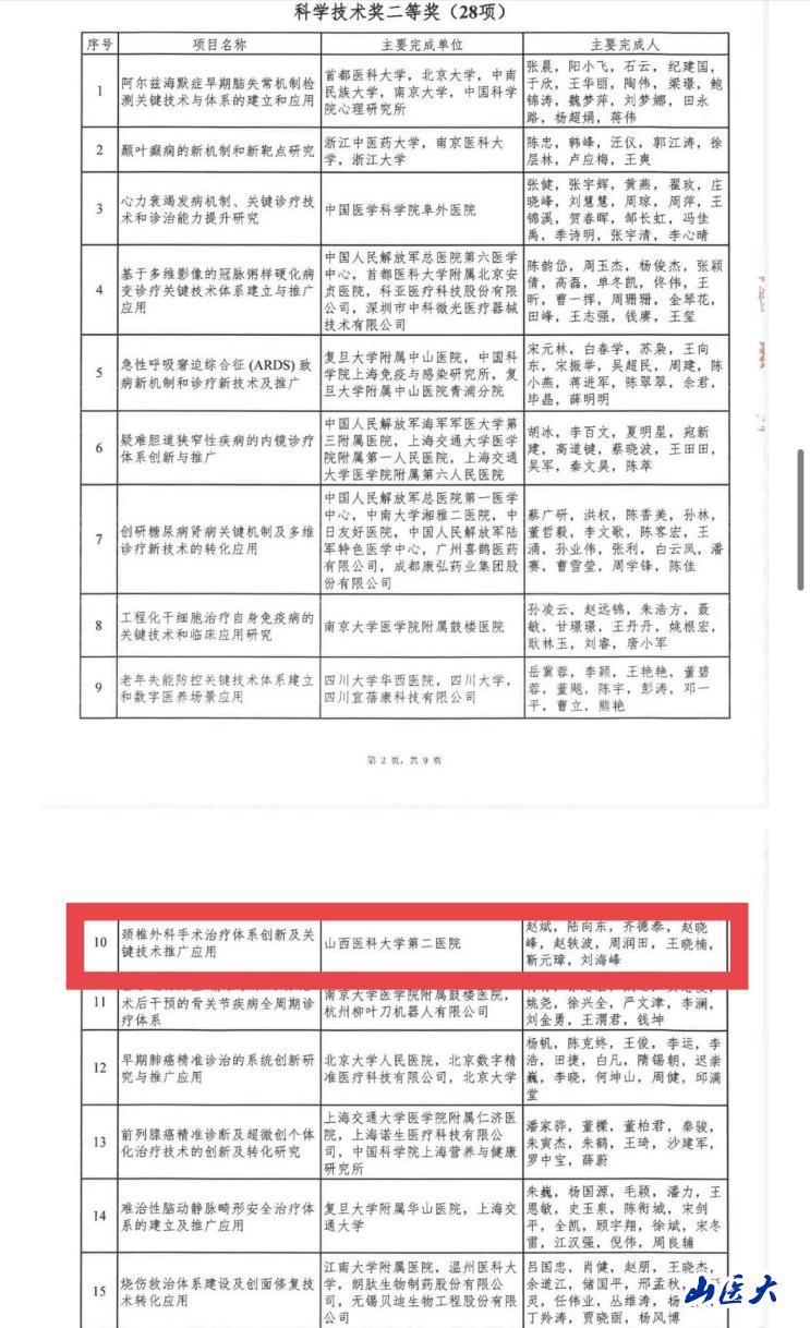日前,中国医疗保健国际交流促进会公布“华夏医学科技奖”名单,我校第二医院骨科赵斌教授团队“颈椎外科手术治疗体系创新及关键技术推广应用”项目,斩获2024年度华夏医学科学技术奖二等奖,获奖团队成员有赵斌、陆向东、齐德泰、赵晓峰、赵轶波、周润田、王晓楠、靳元璋、刘海峰。