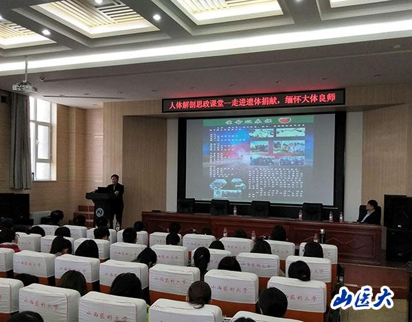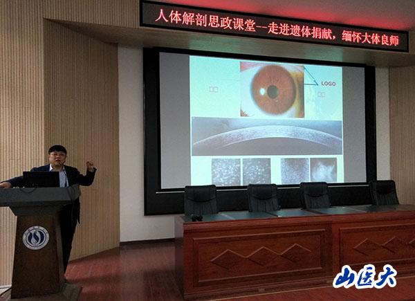 3月20日下午,基础医学院人体解剖思政课堂活动在中都校区基础报告厅举行。本次思政课堂特邀原太原市红十字会秘书长、山西省遗体捐献工作开拓者田兆渠;山西省眼科医院角膜病科主任、中华医院会山西眼科分会角膜组副组长杨纪忠教授,作了遗体捐献和角膜捐献的专题报告。解剖教研室和实验室全体老师以及三百多名本科生参加了本次思政课堂活动。