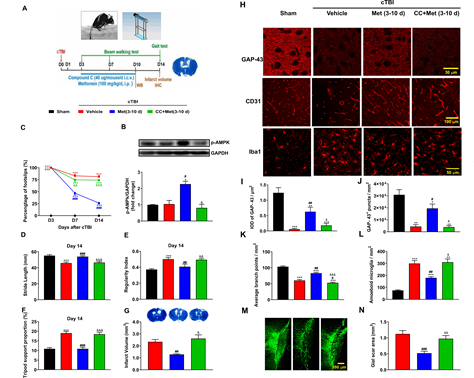 图1.延迟性二甲双胍处理通过激活中枢AMPK促进脑外伤后的神经功能恢复及组织修复