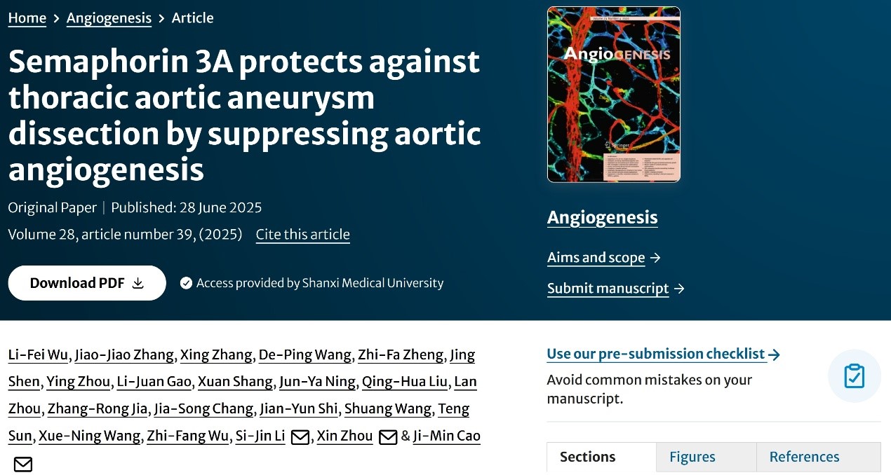 2025年6月28日,我校细胞生理学教育部重点实验室曹济民教授团队在血管再生领域的国际权威期刊《Angiogenesis》(中科院一区TOP期刊,IF=9.2)在线发表了题为“Semaphorin 3A protects against thoracic aortic aneurysm dissection by suppressing aortic angiogenesis”的研究论文(DOI: 10.1007/s10456-025-09992-6)。该研究发现,信号素3A (Semaphorin 3A, Sema3A)通过抑制胸主动脉壁内血管新生、细胞外基质降解及炎症反应,而抑制胸主动脉瘤(TAA)进展和夹层(TAAD)形成。这一工作利用TAA/TAAD患者数据库及胸主动脉标本、Sema3A条件性过表达和敲除小鼠以及细胞模型,揭示了Sema3A是一种内源性的TAA保护因子,并发现外源性给予Sema3A重组蛋白可明显减轻小鼠TAA的进展和TAAD的发生。该研究为TAA的非手术防治提供了新的可能性以及潜在的药物靶点。基础医学院武栗妃讲师(曹济民教授2020级博士研究生)为论文第一作者,曹济民教授为主通讯作者。