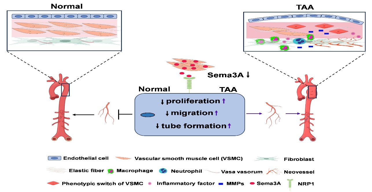 在正常主动脉壁中,由血管平滑肌细胞(VSMC)来源的Sema3A维持着生理水平。Sema3A具有抑制血管新生的作用。Sema3A作用于其在内皮细胞上的受体NRP1,抑制内皮细胞增殖、迁移和成管,从而防止胸主动脉病理性血管新生,维持主动脉稳态。TAA时主动脉Sema3A表达水平降低,从而促进主动脉壁血管新生、TAA的进展和TAAD发生。