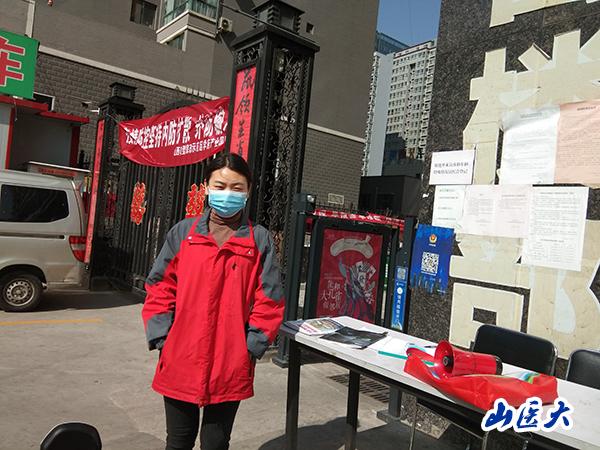 (2019级研究生薛悦同学正在对各社区过往人员进行防疫知识科普宣传)