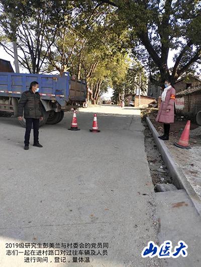 (2019级研究生彭美兰同学与村委会其他党员同志在进村口设卡进行来往人员情况登记工作)