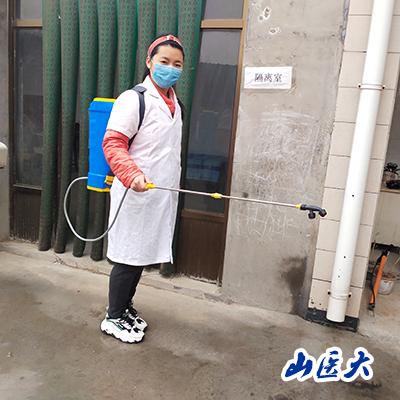 (2019级研究生谈佳音同学在村领导安排下对村里的被服厂进行现场消杀工作)