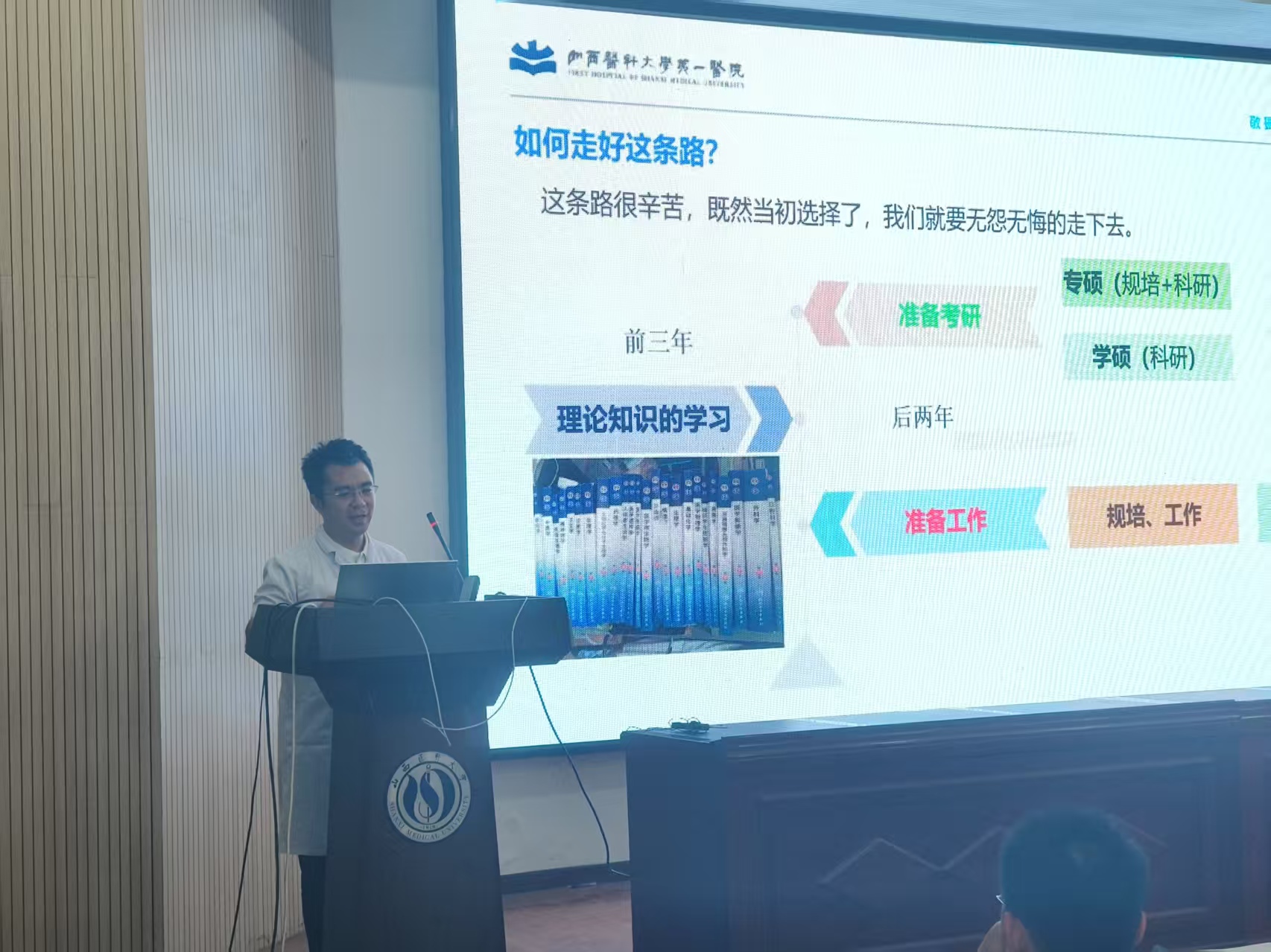 报告中,刘鹏鸿副教授围绕科研动力、科研意义与临床实例三大维度,系统阐述了医学生的科研成长路径。他强调,守护生命的初心是驱动医学生投身科研的根本动力。针对医学生成长,刘教授深入剖析了不同阶段的关键任务:本科阶段需筑牢《生理学》《诊断学》等核心课程基础;毕业后无论是选择专硕、学硕还是规培,科研能力都是不可或缺的核心素养。刘老师结合其团队在青少年抑郁症非自杀性自伤行为领域的突破性研究,生动展示了科研如何服务临床:通过构建数据库、开展实验,为临床诊疗提供了新视角和新方案。他进一步以渐冻症治疗研究等为例,深刻阐释了科研工作者肩负的家国情怀与时代使命。针对临床与科研如何平衡这一普遍难题,刘老师分享了宝贵的实践经验。他倡导从临床实践中敏锐发现问题,利用碎片化时间高效推进研究,形成“临床问题驱动科研探索,科研成果反哺临床实践”的良性循环。同时,他建议学生积极争取科室支持、优化个人培养策略,实现临床能力与科研素养的协同提升。