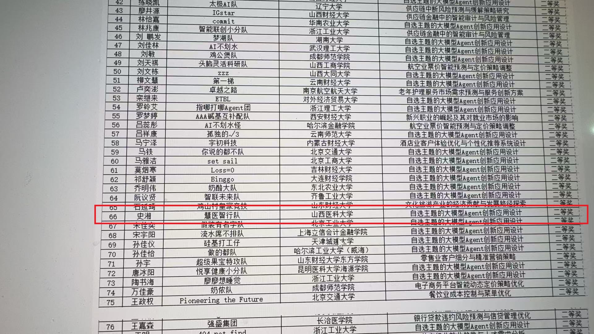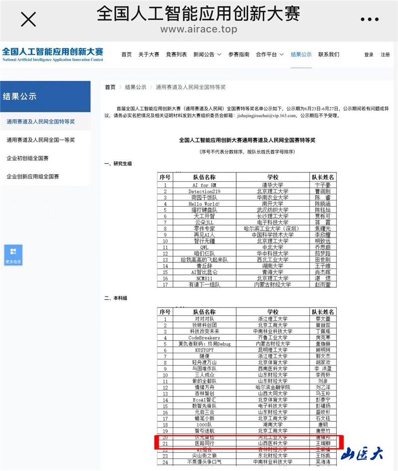 6 月 22 日,为期3天的首届全国人工智能应用创新大赛总决赛在湖南大学圆满落下帷幕。在这场汇聚全国AI创新力量的赛事中,计算机教学部指导的计算机科技创新联盟社团参赛队伍脱颖而出,由我部闫冰老师指导的“医路同行” 参赛队、“慧医智行”参赛队分别斩获特等奖、国家二等奖,该比赛成绩彰显了山医学子的AI创新实力。