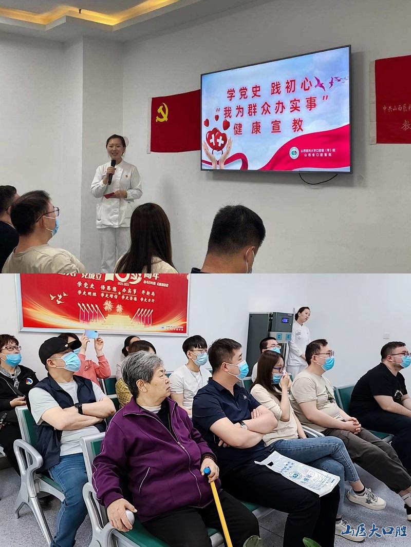 5月12日上午9点30分,我院健康宣教活动在门诊一楼种植科候诊区隆重举行。由教工第五党支部书记郝四芳组织,党员赵静、徐娟、陈玲、刘卓卿,入党积极分子张鑫组成的宣讲团队以日常工作中具体事例为素材,为群众进行了精彩的口腔知识宣教。通过PPT、视频、教具、情景互动等形式,进行深入互动,调动了广大患者对口腔知识学习的积极性,博得患者的阵阵掌声。