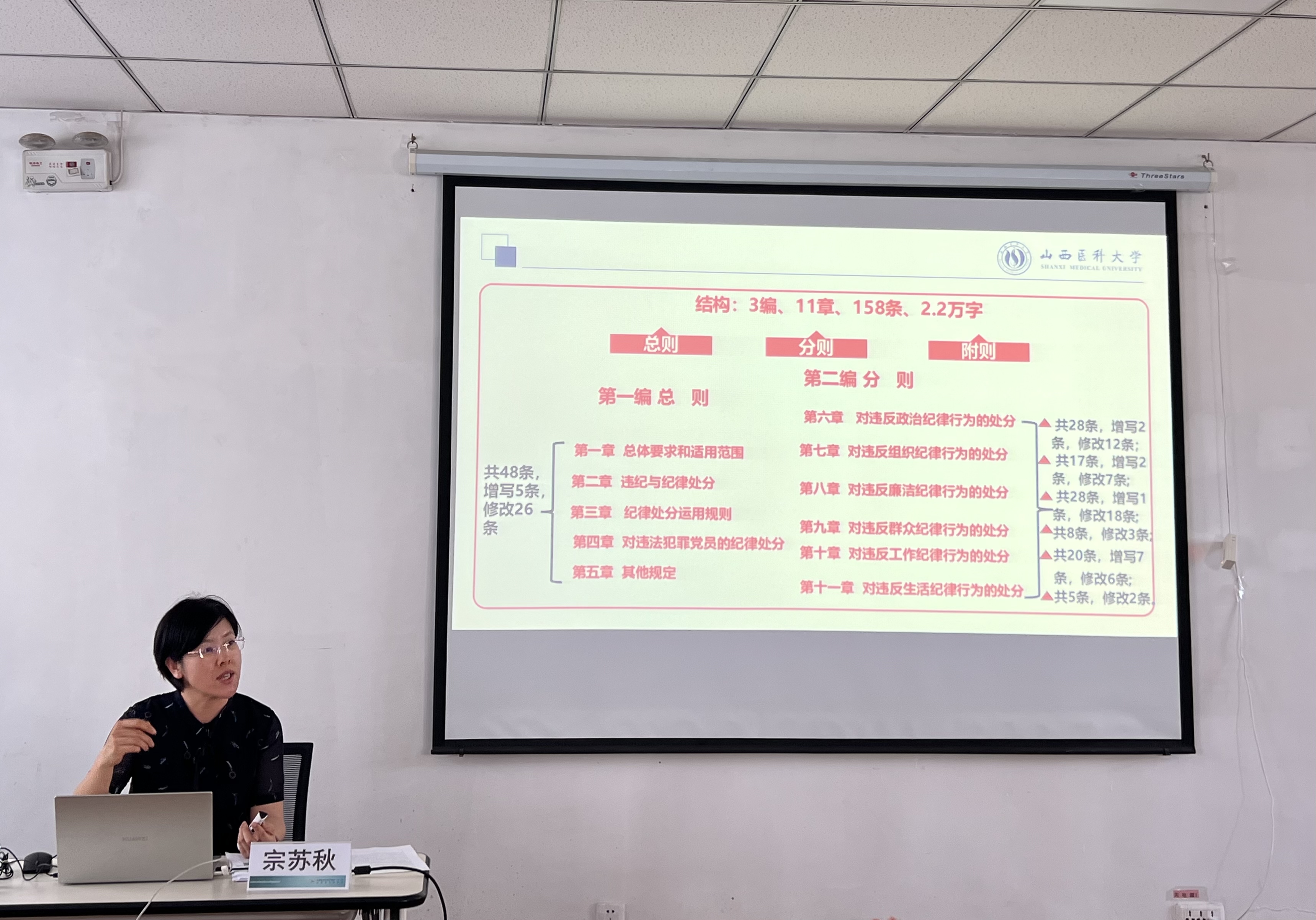 2024年5月23日,口腔医学院(口腔医院)邀请马克思主义学院党纪学习教育教师宣讲团成员宗苏秋,以《政治纪律是最重要、最根本、最关键的纪律》为题作党纪学习教育专题辅导。院领导、师生党支部党员代表、青年学习小组成员、中层干部参加辅导。