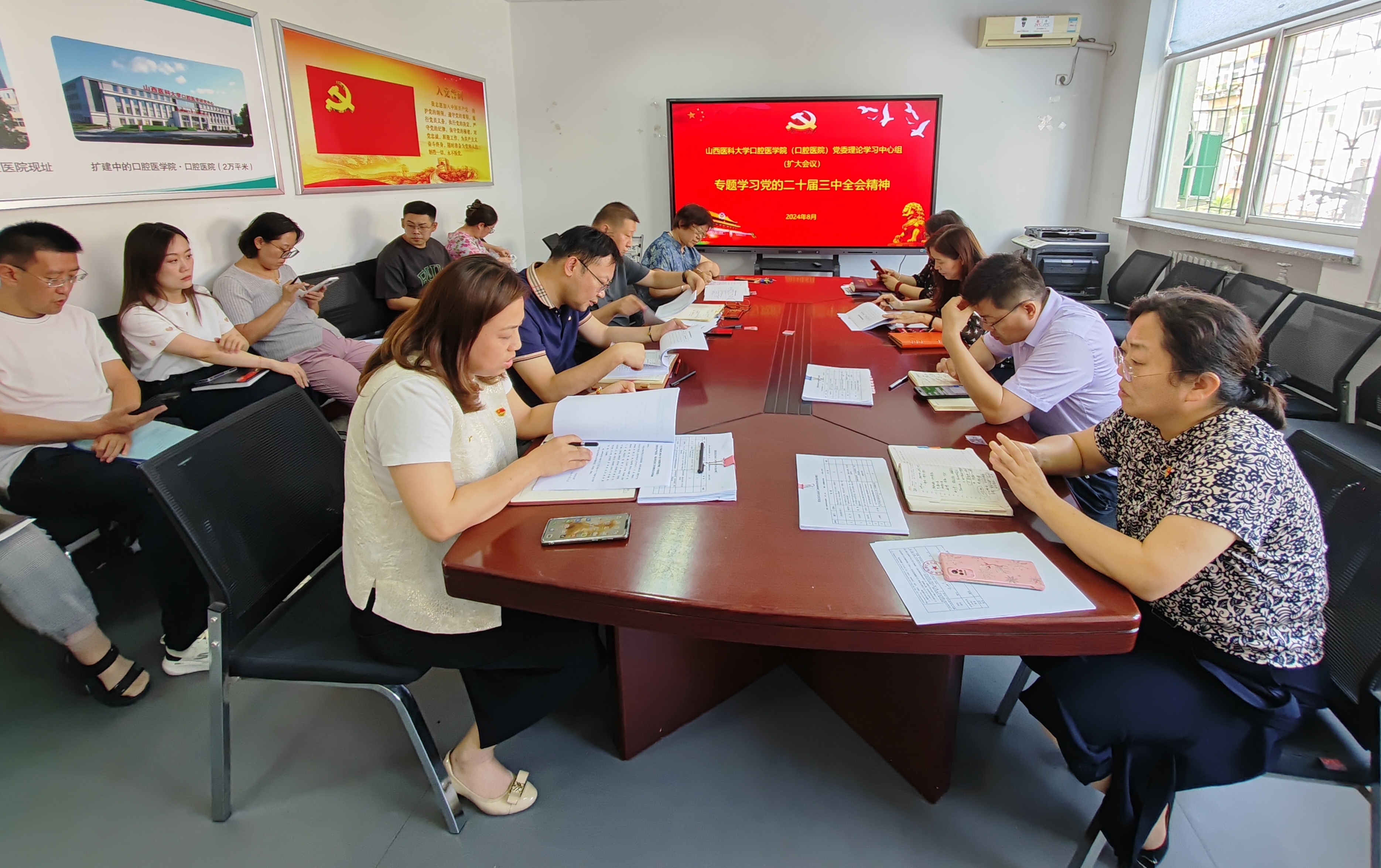 8月12日及19日,口腔医学院(口腔医院)分别召开党委理论学习中心组及中层干部大会,传达学习党的二十届三中全会精神。全体院领导,各临床科室、行政职能部门负责人参加学习。党委书记任秀云主持会议。
