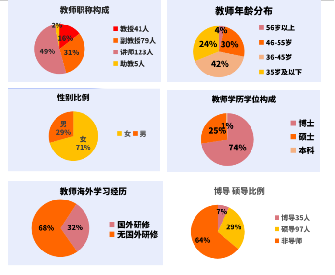 截至目前教职工298,其中教师251,教辅 43 ,管理人员 10 ;教授 41 ,副教授 79 ;博士生导师 21,硕士生导师 83 。