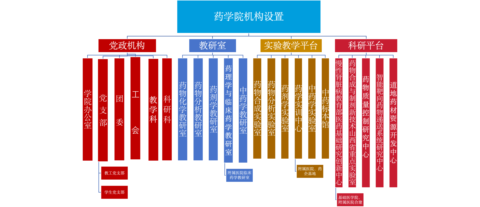 学院现有教职工93人,其中专任教师72人,教授15人,副教授18人,具有博士学位教师71人,博士生导师14人,硕士生导师50人(含兼职导师),教育部高等学校药学类专业教指委委员2人,“新世纪百千万人才工程”国家级人选1人,山西省高校中青年创新拔尖人才2人,山西省教学名师2人,山西省学术技术带头人2人,山西省青年学术带头人2人,青年三晋英才4人,柔性引进国家级人才6人。拥有山西省科技创新重点团队,山西省1331工程重点团队等。