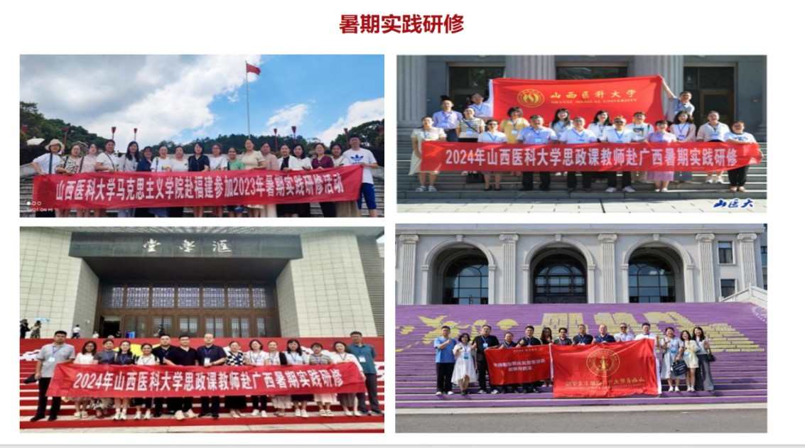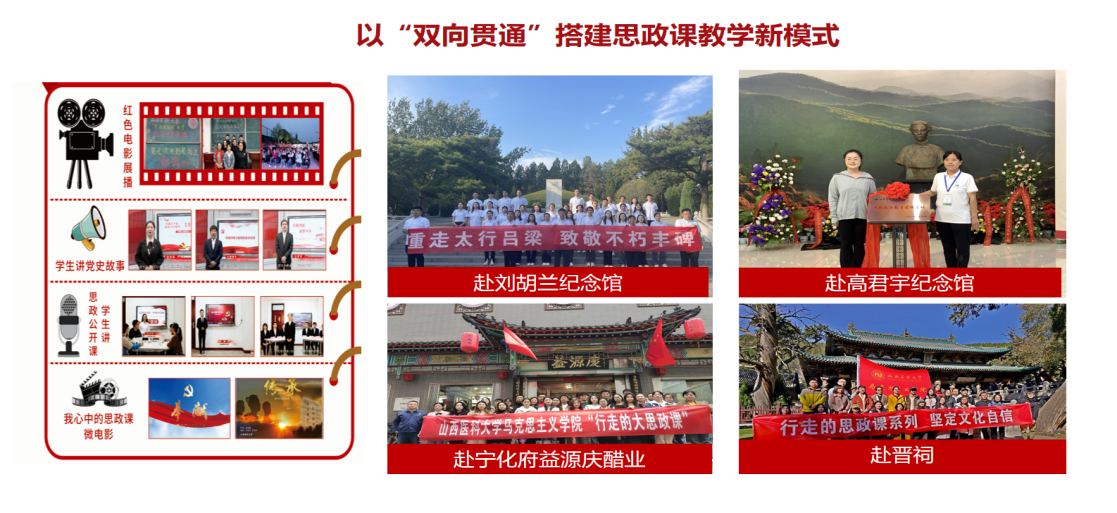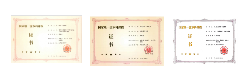 近年来,教学改革成效显著。一是《毛泽东思想和中国特色社会主义理论体系概论》《“情境体验”思政实践课》《医德教育实践》课程获批国家一流本科课程,本科6门思政必修课全部实现省级以上精品课程全覆盖。二是由人民日报出版社出版的《医科院校思想政治理论课教学特色资源库建设研究》(原理卷、概论卷、基础卷、纲要卷)受到了国内诸多医学院校的高度评价和推广运用,获评2017年山西省教学成果奖(高等教育)特等奖。