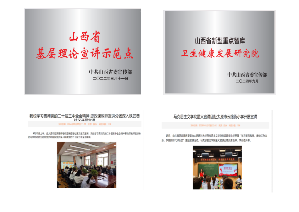 学院立足学科优势与专业特长,积极推动理论成果转化为服务社会发展的实际行动。作为山西省首批“全省基层理论宣讲示范点”,学院深入企业、农村、社区等基层一线,持续广泛开展各类理论宣讲,让党的创新理论在基层落地生根、入脑入心。2024年9月,学院获批山西省新型重点智库“卫生健康发展研究院”,充分发挥智库作用,为政策法规制定和战略规划提供有力支持。此外,学院还积极承担各类横向科研项目,以实际成效助力经济社会高质量发展。
