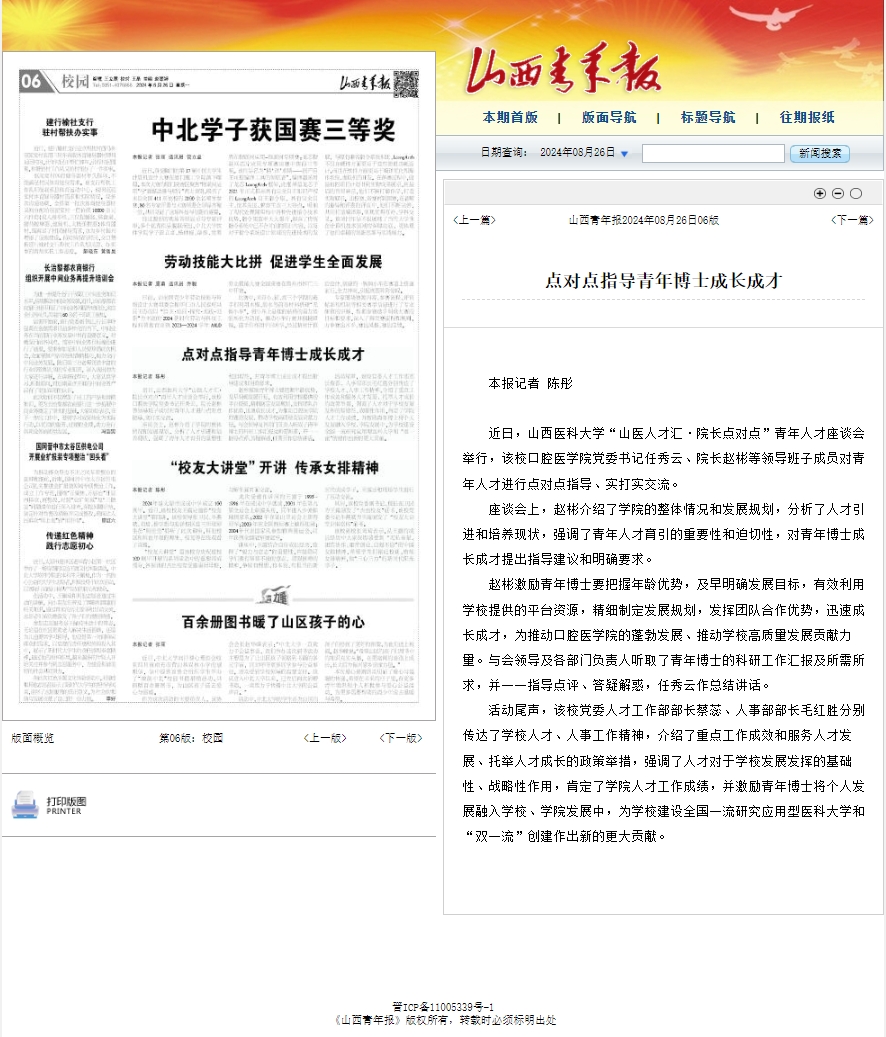 赵彬激励青年博士要把握年龄优势,及早明确发展目标,有效利用学校提供的平台资源,精细制定发展规划,发挥团队合作优势,迅速成长成才,为推动口腔医学院的蓬勃发展、推动学校高质量发展贡献力量。与会领导及各部门负责人听取了青年博士的科研工作汇报及所需所求,并一一指导点评、答疑解惑,任秀云作总结讲话。