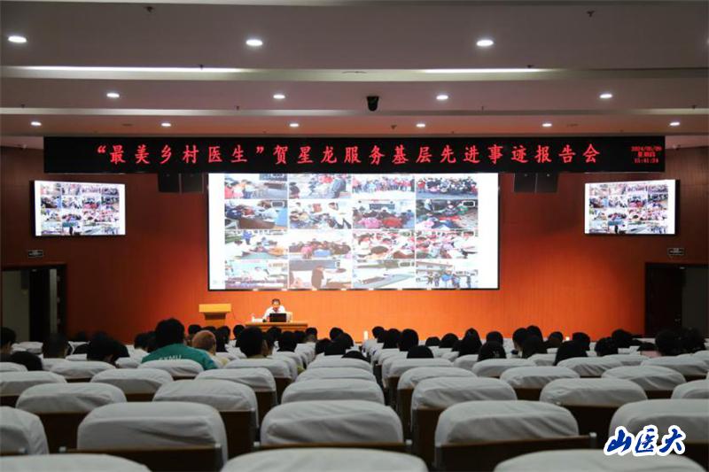 随后,在我校中都校区图书馆多功能报告厅举办了青春为中国式现代化挺膺担当——“最美乡村医生”贺星龙服务基层先进事迹报告会。报告会由学生工作部、团委、毕业生就业指导中心共同组织,思政辅导员、各院系分团委书记及学生代表共计200余人参加了报告会。