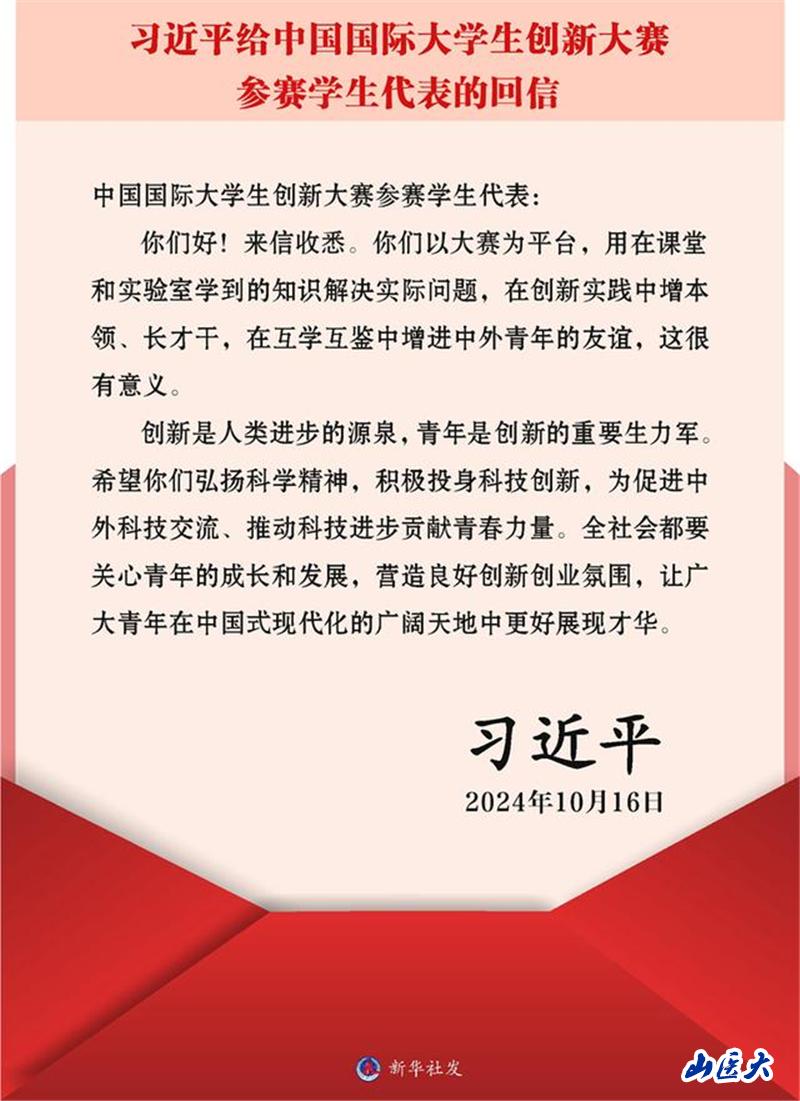 近日,中共中央总书记、国家主席、中央军委主席习近平给中国国际大学生创新大赛参赛学生代表回信,对他们予以亲切勉励并提出殷切希望。