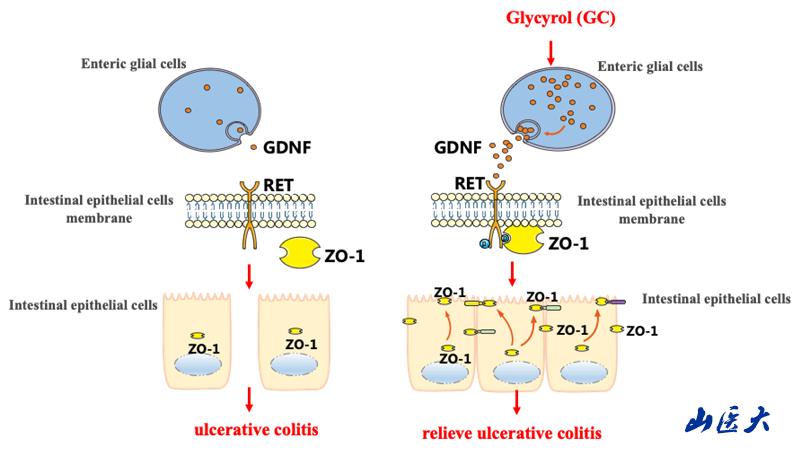 溃疡性结肠炎(UC)因其病程长、癌变检出率高、并发症多,且呈现出年轻化、反复发作、迁延不愈等特点,被称为“绿色癌症”。最新数据显示,中国有229.6万人患有UC,且发病率逐年持续增加。然而,目前UC仍缺乏彻底治愈的医疗手段,缓解UC患者的肠道“痛点”,改善其健康状况,是备受患者、家属、医生乃至科研人员关注的难点问题。UC的发病与多种因素紧密相关,本研究聚焦肠粘膜机械屏障,从“肠胶质细胞调控肠上皮细胞”的新视角,提出“甘草酚通过促进肠胶质细胞GDNF产生,激活GDNF/RET途径,促进ZO-1与细胞膜融合,保护肠粘膜机械屏障,缓解UC”的科学假说,为UC的防治提供新思路,拓展了保护肠粘膜机械屏障的现有途径。