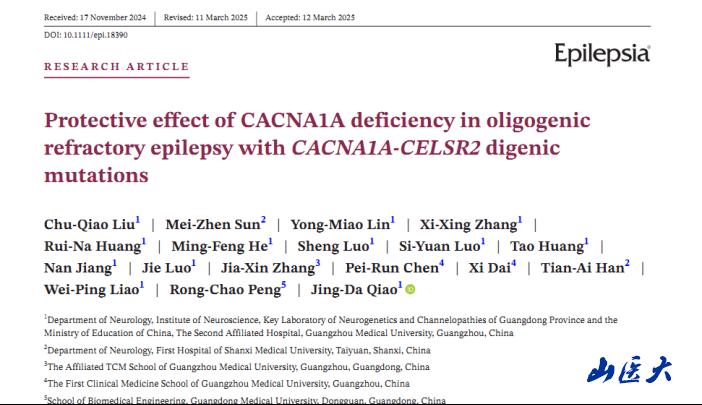 近日,我校第一医院神经内科孙美珍教授与广东医科大学刘楚翘博士、彭荣超教授和广州医科大学附属第二医院神经内科廖卫平教授、乔景达博士合作完成了一项关于癫痫基因相互作用及其在药物难治性癫痫的保护机理研究。该研究在国际期刊《Epilepsia》发表(中国科学院1区,影响因子6.6):Protective effect of CACNA1A deficiency in oligogenic refractory epilepsy with CACNA1A-CELSR2 digenic mutations。该研究聚焦一例同时携带CACNA1A和CELSR2两个罕见基因变异的药物难治性癫痫病例,利用果蝇模型构建多基因突变模型,结合逻辑回归分析,钙成像技术,药物和基因治疗技术,发现癫痫致病基因CACNA1A在不同遗传背景下具有致病/抗癫痫的多重作用,揭示了CACNA1A和CELSR2基因在癫痫发病中的交互作用,为认识寡基因背景下的药物难治性癫痫的发病机理提供了新思路,为其精准治疗带来新的治愈希望。