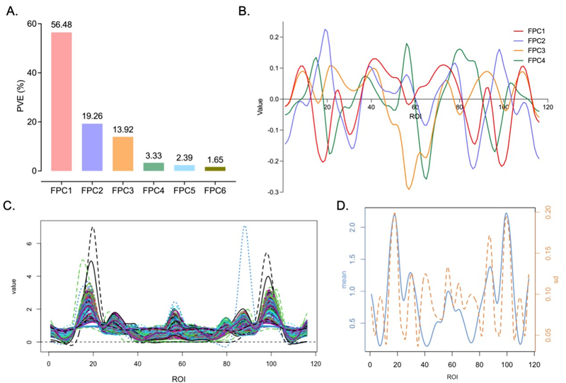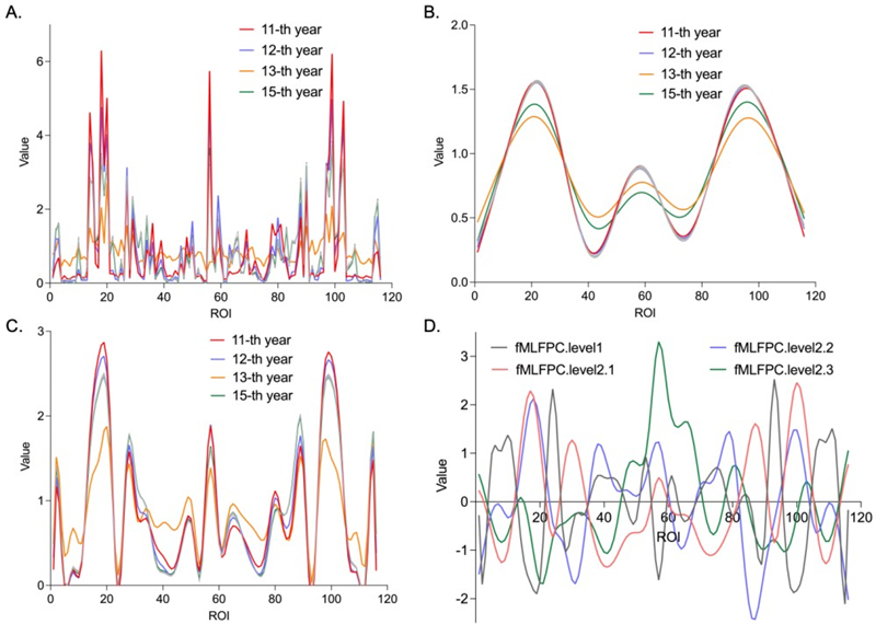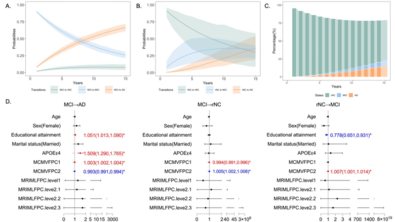 该研究引入双重研究目标(降维与动态建模),采用多变量函数型主成分分析(MVFPCA)捕捉多维度纵向认知的异质性模式(图2),采用多层函数型主成分分析(MLFPCA)提取灰质体积比的时空信息(图3和图4);开发函数型多状态模型,整合上述函数型纵向标志物,以刻画MCI初诊后不同认知状态间的动态转归路径(图5)。