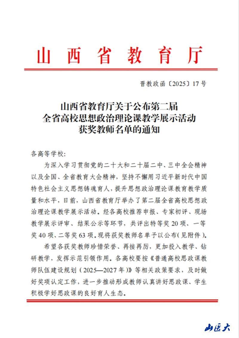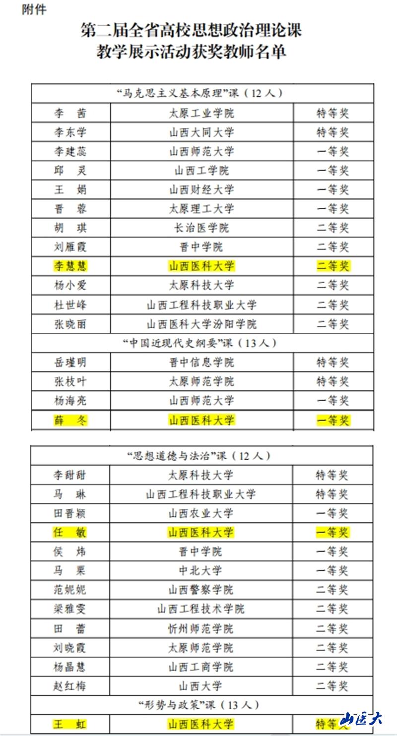 近日,山西省教育厅公布第二届全省高校思想政治理论课教学展示活动获奖教师名单,我校马克思主义学院教师王虹荣获本科组“形势与政策”课特等奖,薛冬荣获本科组“中国近代史纲要”课一等奖,任敏荣获本科组“思想道德与法治”课一等奖,李慧慧获本科组“马克思主义基本原理”课二等奖。