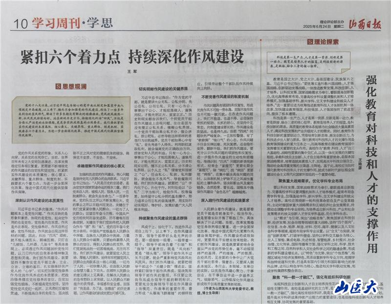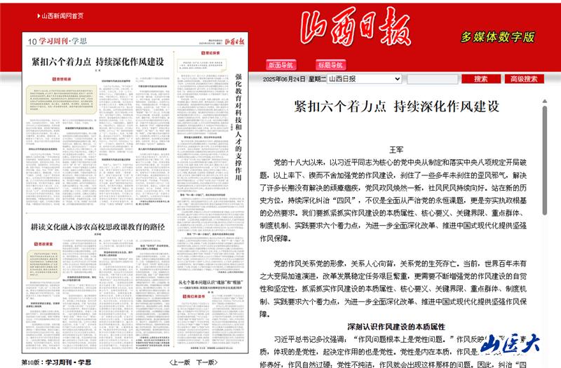 《山西日报》“学习周刊·学思”版头条刊发校党委书记王军理论文章:紧扣六个着力点 持续深化作风建设