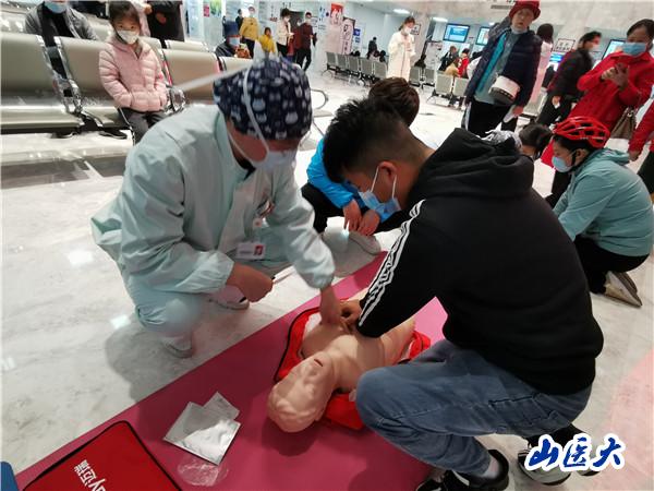 李伟亮老师和尹付连老师为现场群众讲解了白金十分钟理念,演示了心肺复苏、AED操作和婴儿气道异物梗阻急救法,通过讲解,使民众对心肺复苏操作有了更深的了解,旨在着力加强社会自救互救建设,努力普及“人人学急救,急救为人人”的理念。