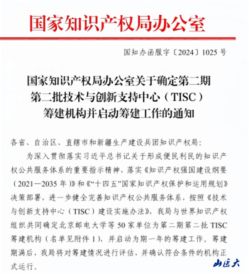 近日,国家知识产权局办公室正式发布《国家知识产权局办公室关于确定第二期第二批技术与创新支持中心(TISC)筹建机构并启动筹建工作的通知》(国知办函服字〔2024〕1025号),经过地方推荐、专家遴选及国家知识产权局与世界知识产权组织(WIPO)共同确定。我校入选第二期第二批技术与创新支持中心(TISC)筹建单位(全国共50家),是山西省目前唯一入选的高等院校。该项目由我校图书馆牵头组织申报、负责筹建。