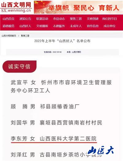 9月2日,山西省文明办公布2022年上半年“山西好人”评选结果,我校第二医院神经内科主任李东芳教授入选“诚实守信”类别“山西好人”。