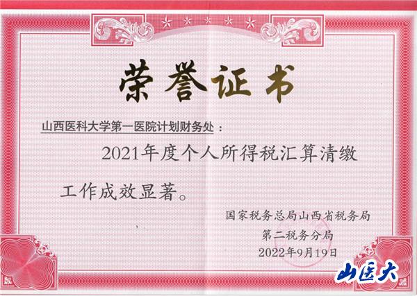 9月19日,国家税务总局山西省税务局第二税务分局组织召开2021年度个人所得汇算清缴工作交流会,通报表彰汇算工作完成较好的单位。第一医院计划财务处获通报表彰,并在省级医院财务处室中位列第一名。