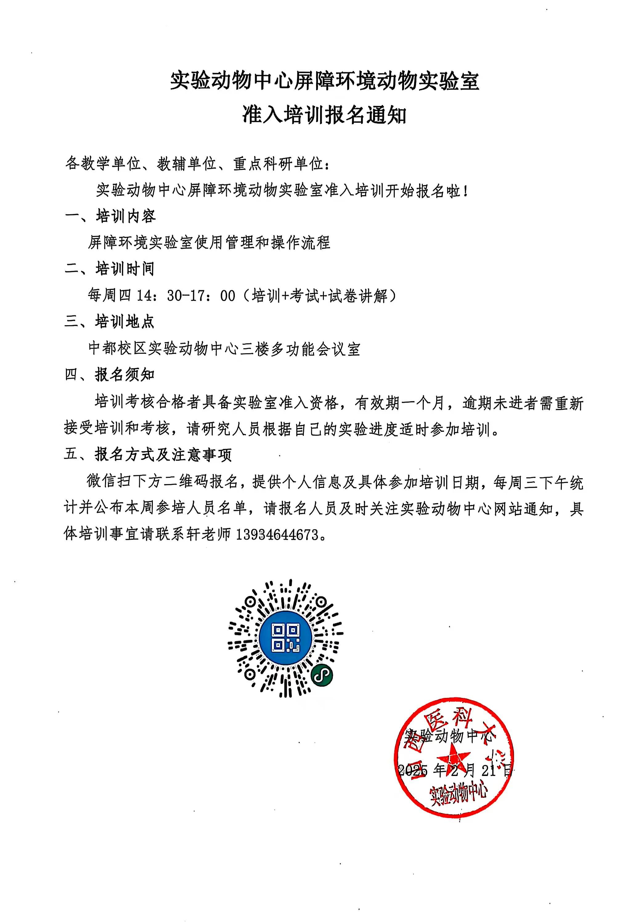各位报名人员请注意:培训合格距离首次进入屏障环境开展实验超过一个月,需重新接受培训考核,因此,一个月内没有动物实验计划的请勿报名,望周知!