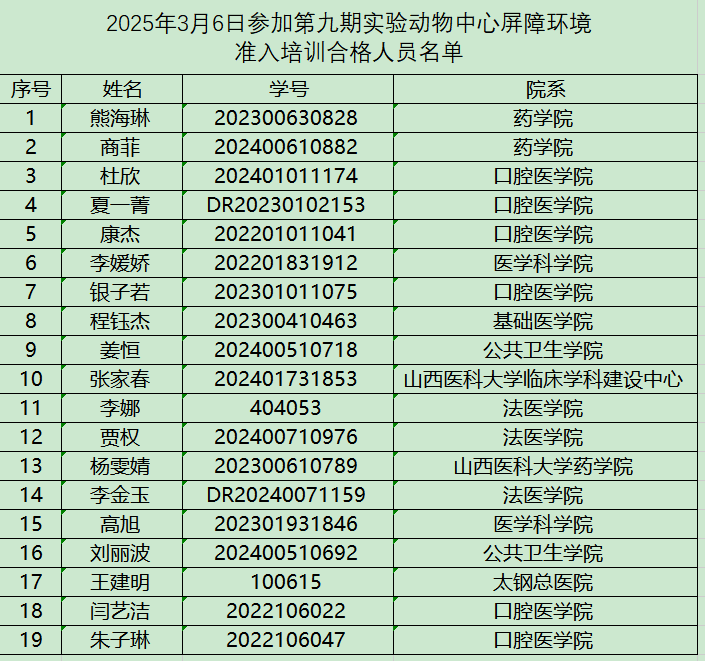 第九期屏障环境准入培训合格人员名单-实验动物中心
