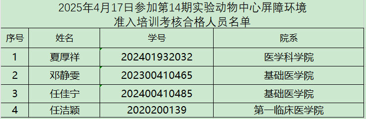 第14期屏障环境准入培训合格人员名单-实验动物中心