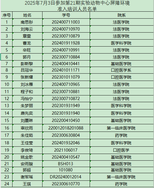 请以下参培人员于2025年7月3日下午14:30到实验动物中心三层多功能会议室参加培训和考试!