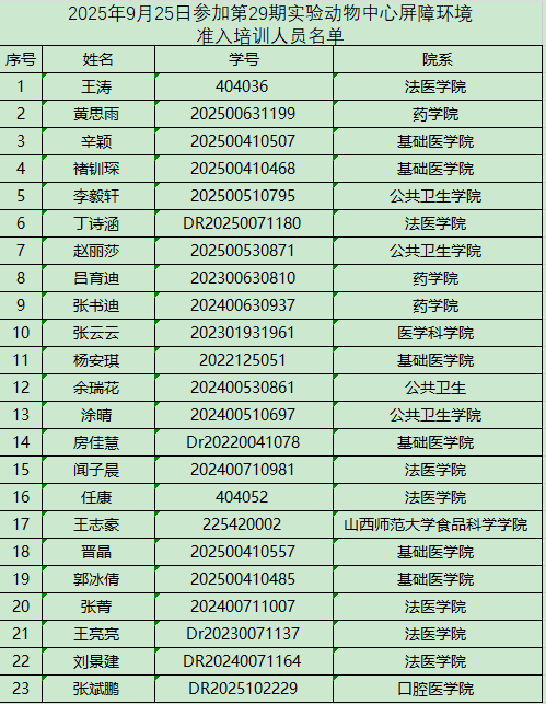 请以下参培人员于2025年9月25日下午14:30到中都校区实验动物中心三层多功能会议室参加培训和考试!