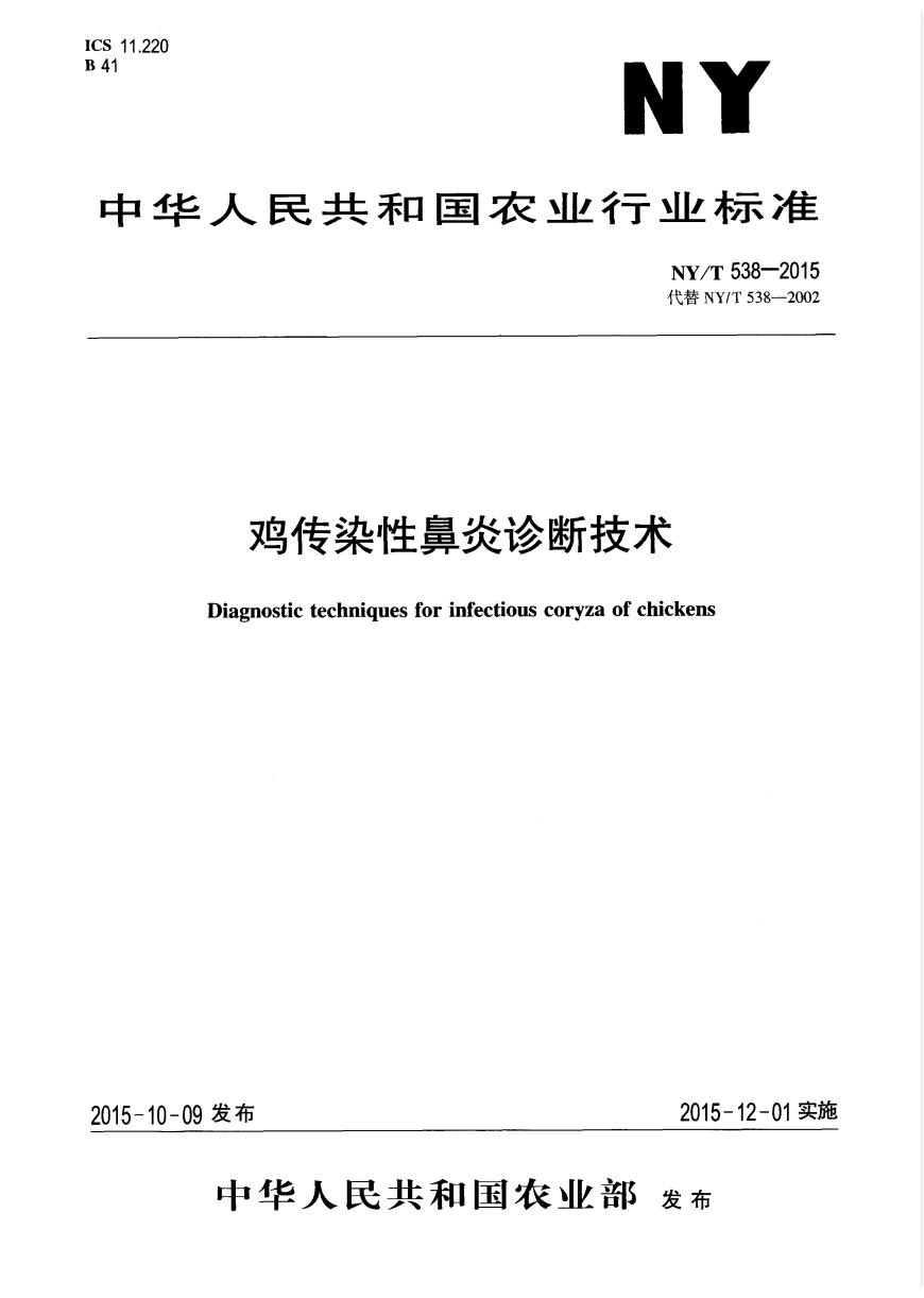 NY-T 538-2015 鸡传染性鼻炎诊断技术-实验动物中心
