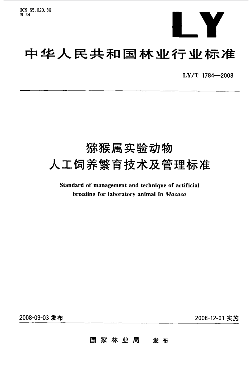 LY-T 1784-2008 猕猴属实验动物 人工饲养繁育技术及管理标准-实验动物中心