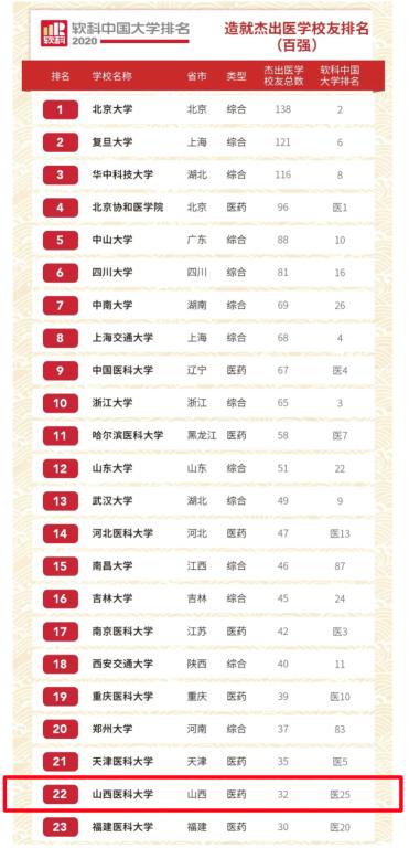 2020软科中国大学造就杰出医学校友排名基于对全国医学门类高水平的专家学者毕业院校的统计,是在充分了解全国所有大学培养医学人才情况的基础上形成的,对高等医学院校人才培养具有客观而重要的指导意义。我校有32名杰出医学校友被列入,位居全国第22名。