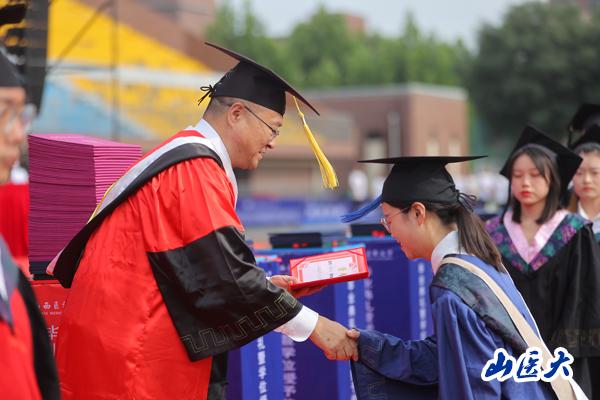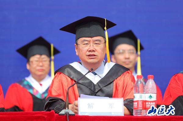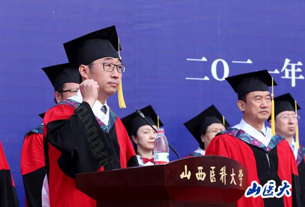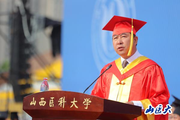 在热烈的掌声中,校长、校学位委员会主席李思进向毕业生致辞。他指出,生命本身是一种崇高的智慧。人类迄今为止,还没完全弄清其中的奥妙。以研究生命为对象的医学,同样是一门需要极高智慧、终身学习的学问,是一门具有极强实践性、人文性的学问。作为一名医者,既要有仁心仁术,更要有大智慧。他以《不负时代,做有“智”山医青年》为题,为毕业生提出了三点要求。一是要明辨是非,把稳思想之舵。在这百年医学殿堂,不仅是学会治病救人的基本知识和技能,步入社会后能够用所学救死扶伤,更重要的是,要学会独立思考,有自己的思想,真正成为你自己。在面对五彩斑斓纷繁复杂的世界,能够明辨是非、辨别善恶、认清真伪,不唯上、不盲从、不跟风;在无数的利益诱惑、大是大非面前,能够把稳思想之舵,能够坚守初心底线,挺得住、站得直、行得端。在任何时候,都要以国家、人民利益为重,做一名有智慧的山医人。二是要终身学习,筑牢立身之本。要养成终生学习的习惯,不要稍有所得就沾沾自喜。通过不断学习、实践,筑牢立身之本,点亮智慧人生,才能更好地为患者服务,为社会服务,为国家服务。三是要奋力担当,不愧青春之我。国家的前途,民族的命运,人民的幸福,是当代中国青年必须和必将承担的重任。要积极投身第二个百年目标的实现,做亲历者和建设者,承担重任,要将“个人梦”融入伟大的“国家梦”“民族梦”中,不负韶华、奋力担当,在担当中历练,在尽责中成长,肩负起国家和民族的希望,书写好新时代的青春篇章,实现好自己、家庭和国家的梦想。
