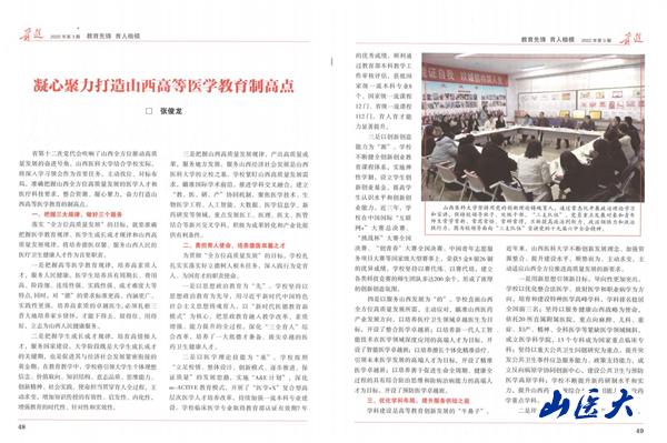 2022年3月,《前进》杂志第355期“教育先锋 育人楷模”栏目刊发校党委书记张俊龙教授署名文章《凝心聚力打造山西高等医学教育制高点》。