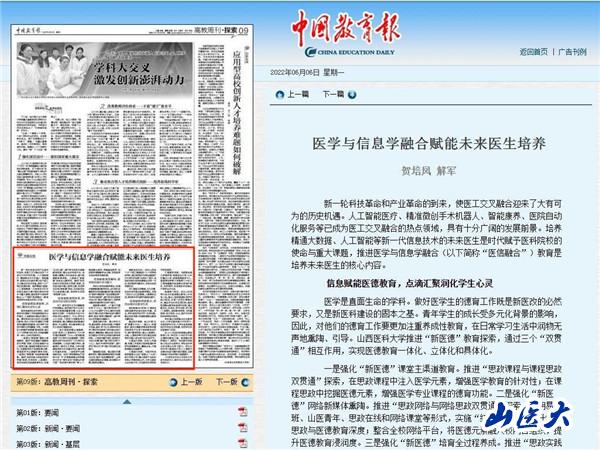 6月6日,《中国教育报》第9版“高教周刊·探索”版刊发我校贺培凤教授、解军教授的联合署名文章《医学与信息学融合赋能未来医生培养》。