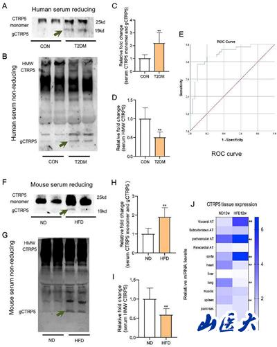 该研究对正常人及糖尿病患者血清中C1q/ tnf -相关蛋白5(CTRP5)进行了检测,首次观察到糖尿病患者血清总CTRP5升高,高分子量(HMW)型降低,而球状型(gCTRP5)显著升高,这些病理改变在糖尿病小鼠中重现。