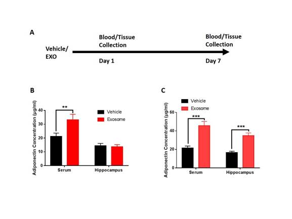 代谢功能紊乱是导致衰老及神经退行性病变的关键危险因素之一。有报道显示,脂联素是调控代谢,抑制肥胖及促进神经再生的关键代谢因子。为了进一步探究hUC-MSCs外泌体对代谢功能的调控水平,作者通过注射hUC-MSCs,利用ELISA法对小鼠外周血及脑组织脂联素进行了检测。在外泌体注射七天后,海马组织脂联素水平显著增高证明了hUC-MSCs外泌体对中枢神经系统代谢因子的调控效应,同时也为后续指导外泌体调控神经系统的治疗时间提供了依据。新事物认知研究证实外泌体注射对生理状态下动物认知功能并无影响。