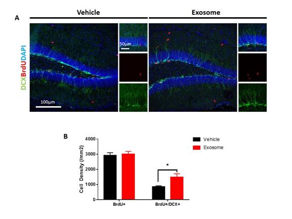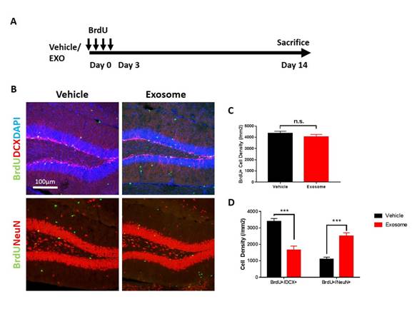 为了进一步确认hUC-MSCs外泌体对海马DG区神经元分化及成熟速度的影响,小鼠在注射外泌体后14天后检测其BrdU阳性的非成熟神经元及成体神经元标记的细胞数。作者为探索hUC-MSCs外泌体对小鼠海马神经分化速度的影响,检测了BrdU/DCX双阳性新生非成熟神经元及BrdU/NeuN双阳性成熟神经元。研究发现hUC-MSCs外泌体促使更多的海马组织新生细胞分化形成了成熟神经元,继而增加了海马DG区的神经再生。
