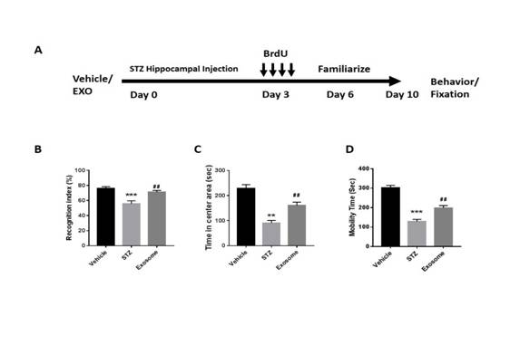 为了进一步研究hUC-MSCs外泌体对病理状态下神经功能的恢复作用,作者采取了链脲佐菌素(STZ)以模拟急性状态下认知功能障碍及脑损伤。STZ作为一种糖尿病造模药物,因其能够通过葡萄糖转运体而破坏胰岛细胞功能。在神经系统中,神经元同样高表达葡萄糖转运体,因此通过海马局部注射STZ可模拟代谢性疾病导致的脑损伤。通过新事物认知实验,以检测hUC-MSCs外泌体对STZ处理后小鼠认知功能的作用。研究发现hUC-MSCs外泌体对STZ引起的急性脑功能障碍具有显著的神经保护作用。