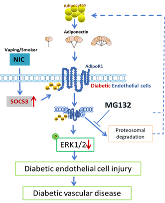 脂联素(adiponectin,APN)是一种新型的脂肪因子,被称为“脂肪细胞产生的胰岛素”。最重要的是,脂联素是维持胰岛素反应性的必要分子。由于新的证据证明APN具有抗糖尿病和心血管保护作用,我们推测APN可能与尼古丁导致的糖尿病血管之间存在联系。脂联素抵抗是指在代谢活跃的器官,包括脂肪细胞、骨骼肌、肝脏和心脏对APN的生物反应降低。我们课题组之前的研究已经证明高脂饮食可导致血管APN抵抗,但很少有报告显示尼古丁是否能够引起血管脂联素抵抗。