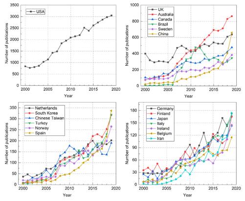 图1发文量排名前20的国家\地区2000年-2020年发文趋势